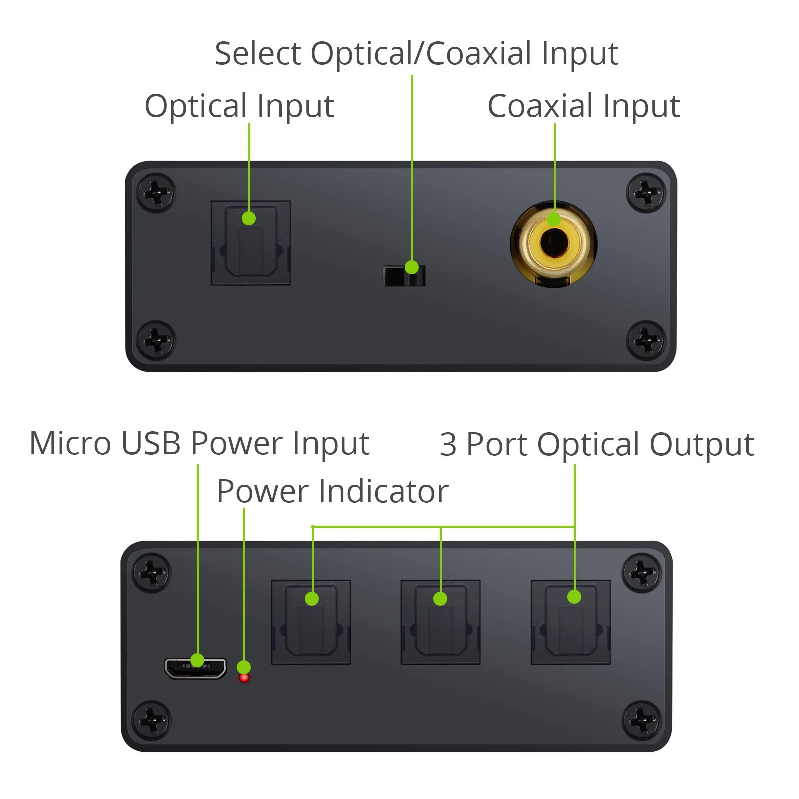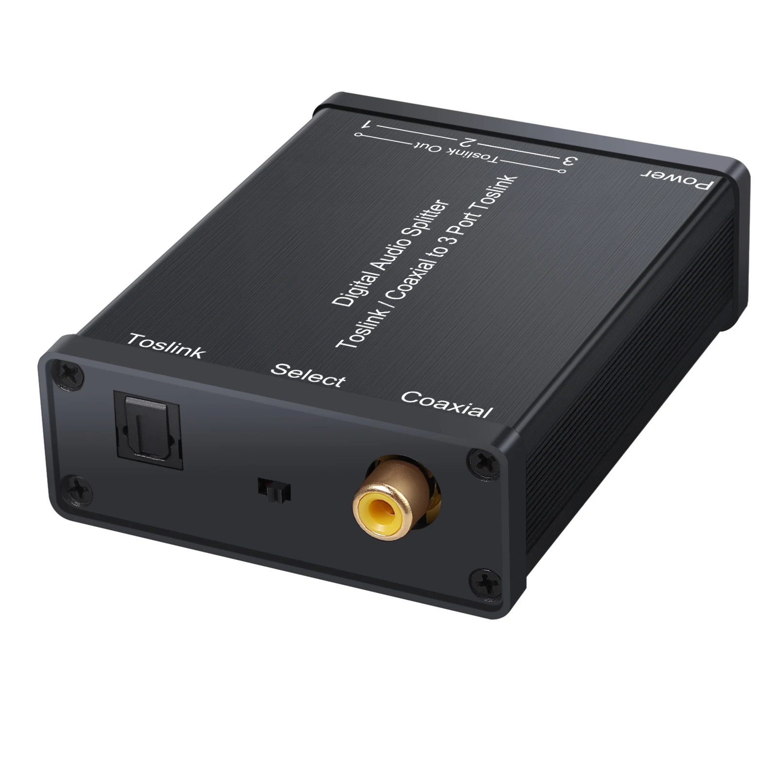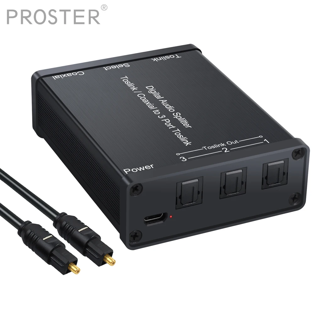 Proster 3 way Spdif Toslink Optical Digital Audio Splitter One input 3 Outputs Optical Splitter Support for LPCM2.0 DTS -AC3 : Click Here Proster 1x3 Toslink Splitter 3 Port SPDIF Toslink Optical Digital Audio Splitter 1 In 3 Out Support LPCM 2.0 DTS DAC Converter : Click Here Proster 16Mbps Digital Optical Audio Switchers SPDIF/Toslink Switcher 2x1 with IR remote support for LPCM2.0/DTS/AC3 : Click Here